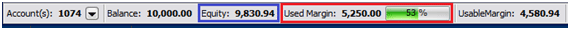 Dalam contoh ini Usable Margin berkurang menjadi nol (Equity - Used Margin) berarti bahwa dana pada akun tidak mencukupi untuk mengelola posisi open yang ada. Seluruh posisi akan ditutup secara otomatis. Hal ini ditunjukkan ketika Margin Utilization Indicator mencapai 100% dengan perhitungan : (equity/used margin)x100%.